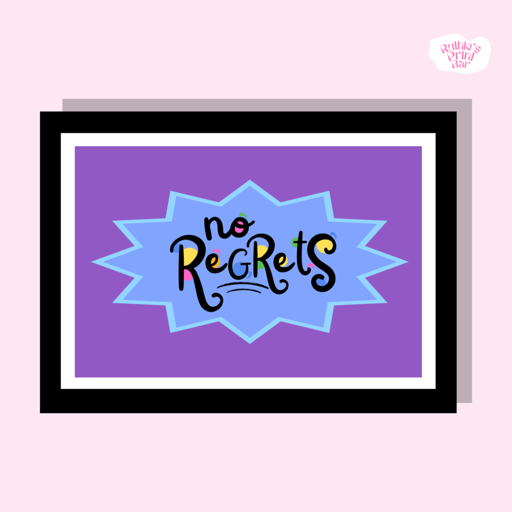 Embrace a life of boundless adventure and positivity with our captivating 'No Regrets' printable poster, beautifully adorned in the delightful Rugrat font theme. With its charming and playful design, this poster serves as a daily reminder to live life to the fullest, cherishing each moment without hesitation or remorse. Crafted with love and attention to detail, this artistic masterpiece brings a nostalgic touch while exuding a contemporary flair. Hang it in your favourite space and let the empowering message inspire you to embrace every opportunity fearlessly. Elevate your decor and mindset with this one-of-a-kind poster, perfect for anyone seeking to embrace a life of joy, optimism and limitless possibilities