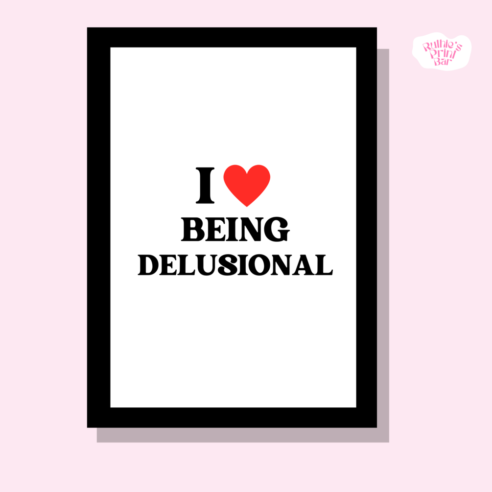 Embrace Your Sassy Side with our Playful Printable Poster: 'I ❤ Being Delusional'! Express your witty charm and love for a whimsical perspective with this eye-catching design. Perfect for adding a touch of humor and attitude to any space. Get yours now and let the world know you embrace the joy of being delightfully delusional!
